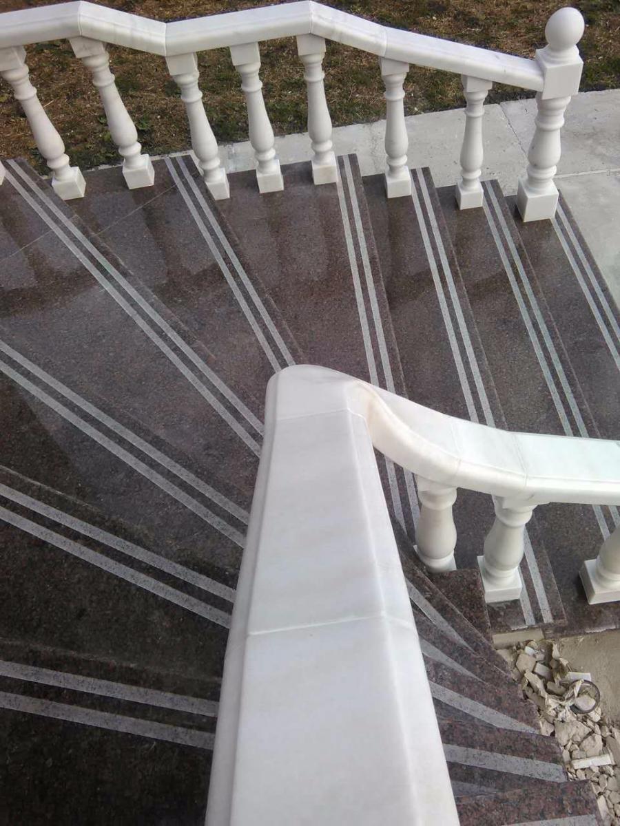 Гранітні сходи в поєднанні з балясинами та поручнями з мармуру білого кольору, додадуть колорит вашій оселі